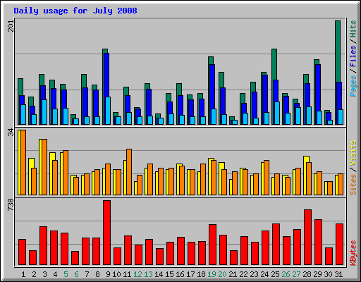 | Day | Hits | Files | Pages | Visits | Sites | KBytes | ||||||